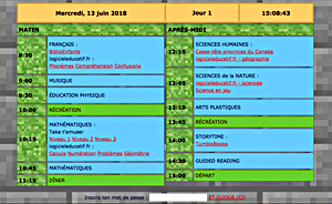 En puisant mes archives Web, j'ai retrouvé cette page que j'avais conçue pour un élève en difficulté: support/index.html L'élève avait du mal à suivre une classe régulière, mais il adorait les ordinateurs et MineCraft. J'ai donc programmé la page pour charger son horaire quotidien selon le jour du cycle scolaire. Comme ça, il savait son horaire et lui et son aide-auxiliaire saurait nous retrouver au cas où l'élève travaillait hors de la salle de classe. En plus, j'ai ajouté un formulaire au fond de la page. Si l'élève avait travaillé fort, l'aide-auxiliaire pourrait inscrire un mot de passe (c'est « macaroni » - chut!) afin de débloquer une autre page de jeux éducatifs.